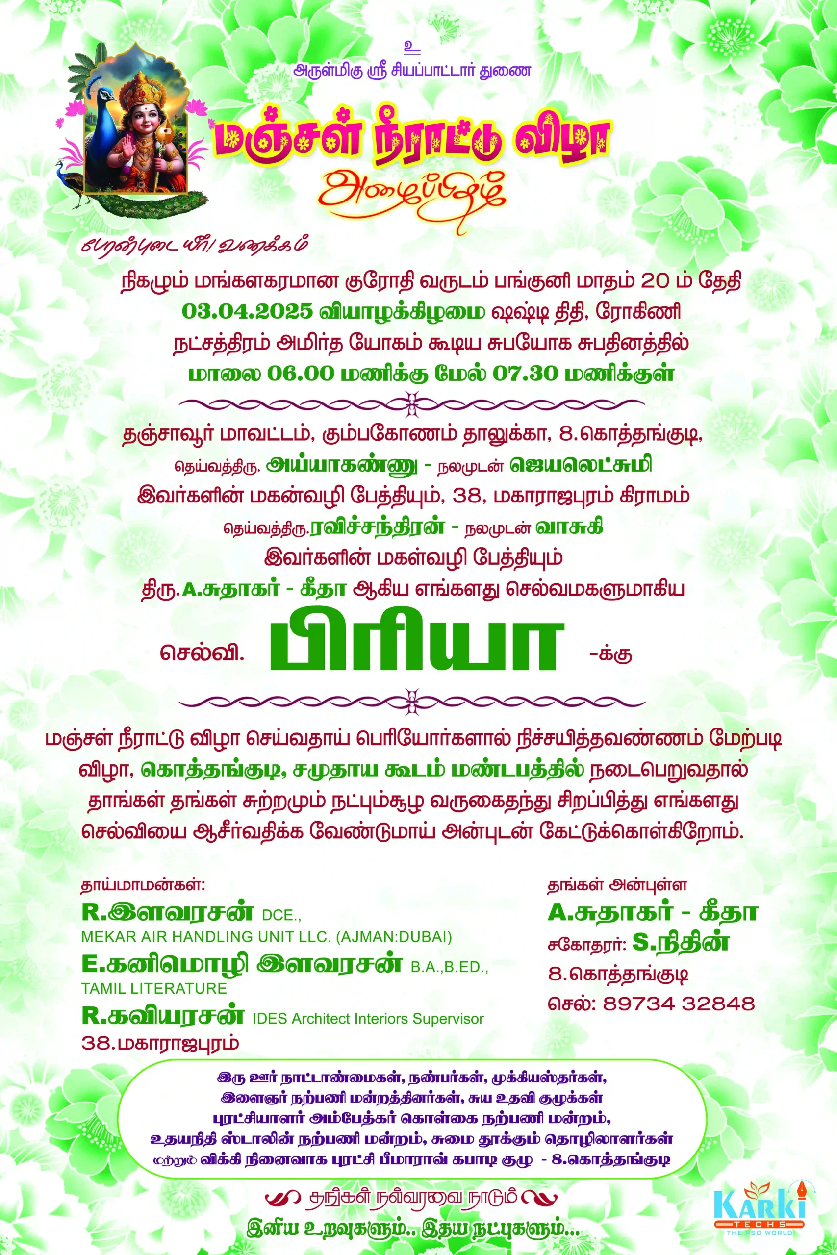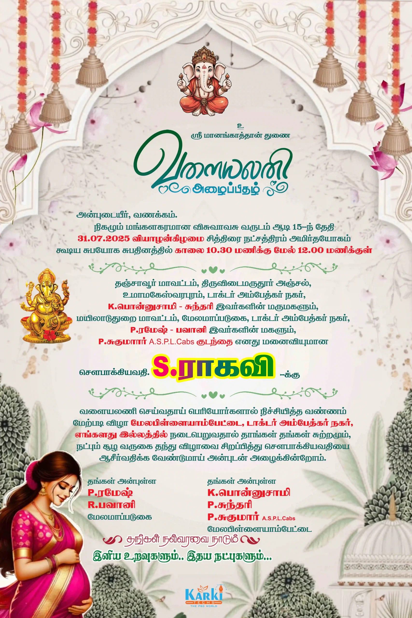 This exclusive collection includes high-quality, print-ready PSD templates specially designed for traditional Tamil occasions like marriage (திருமண அழைப்பிதழ்), puberty (பூப்புனித நீராட்டு விழா), and ear piercing (காதணி விழா).