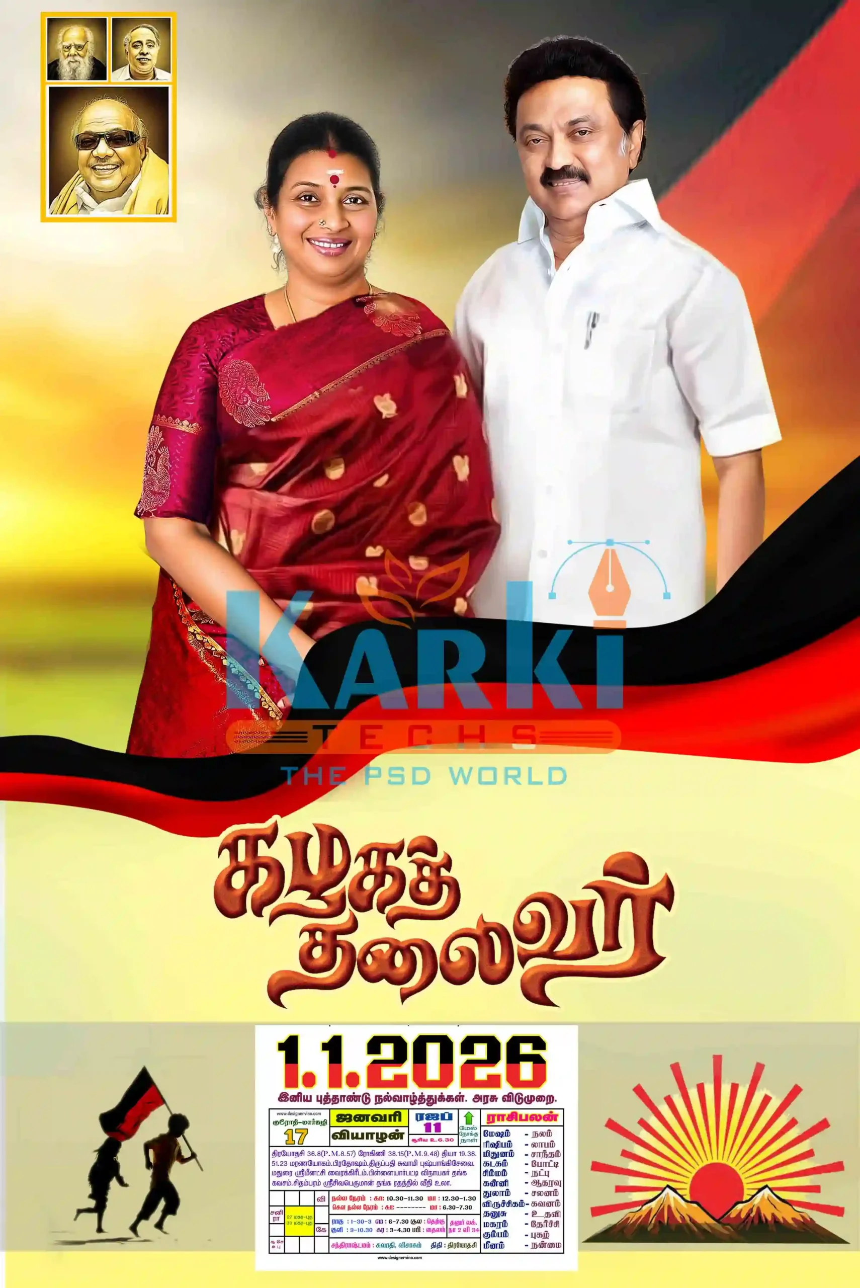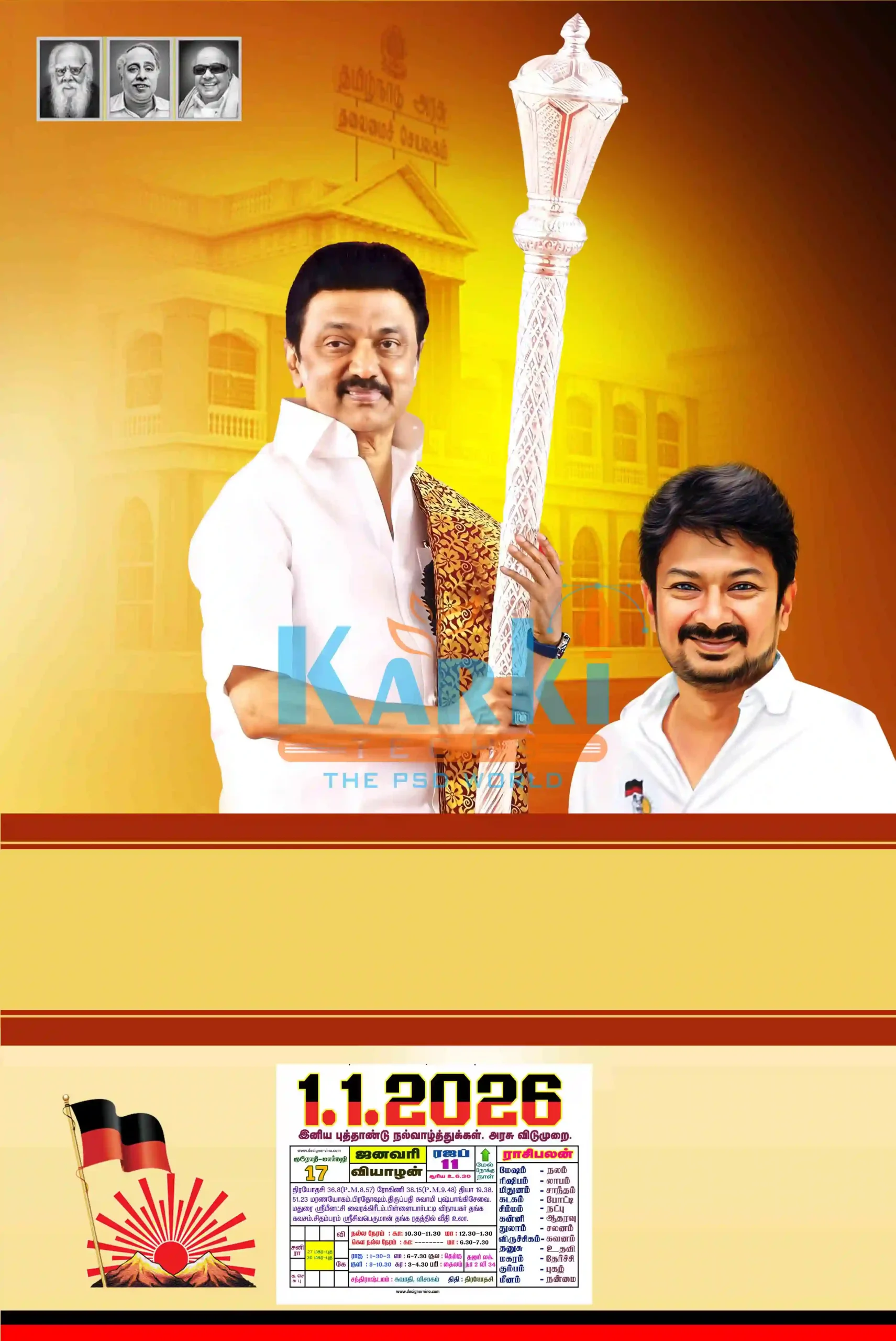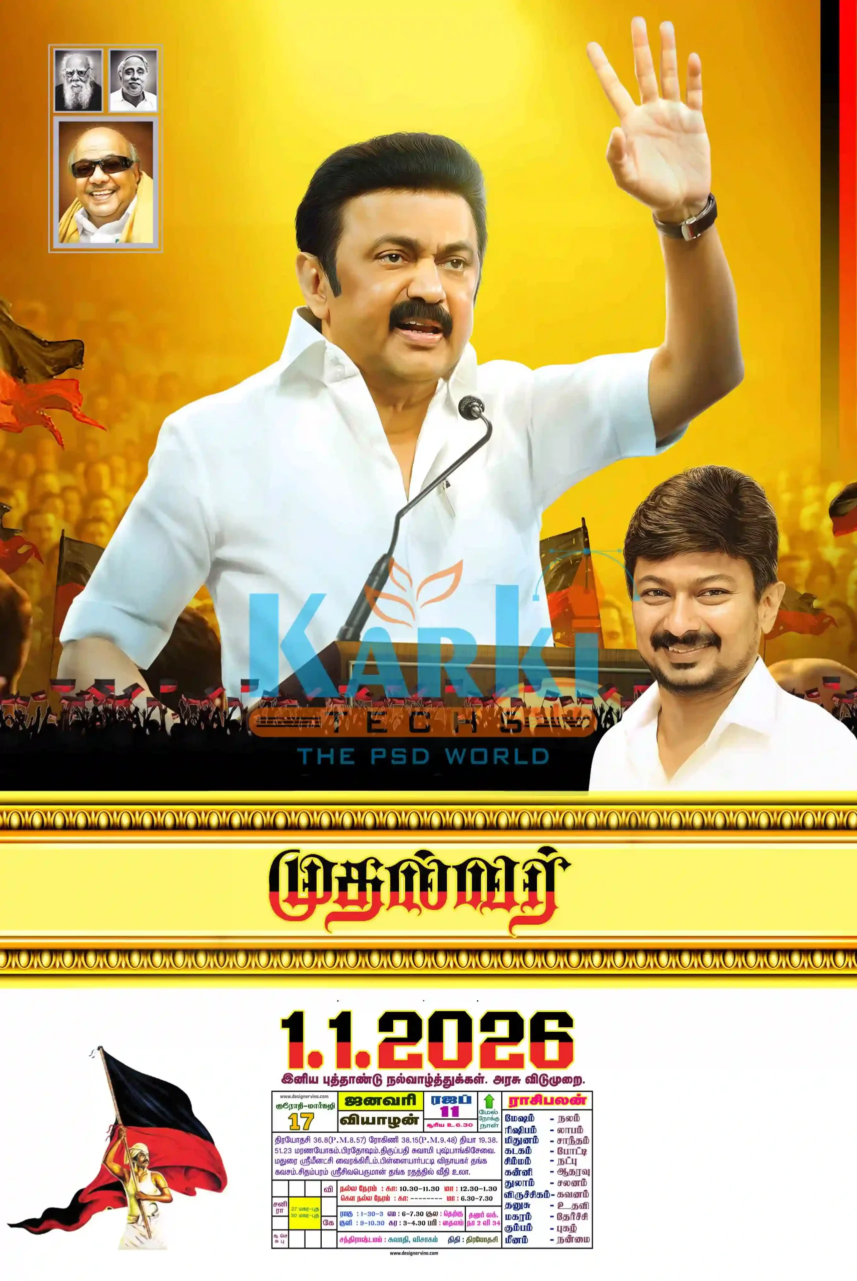 Each design is created with precision, bold colors, and beautiful Tamil typography that represents the spirit of the Dravida Munnetra Kazhagam movement.