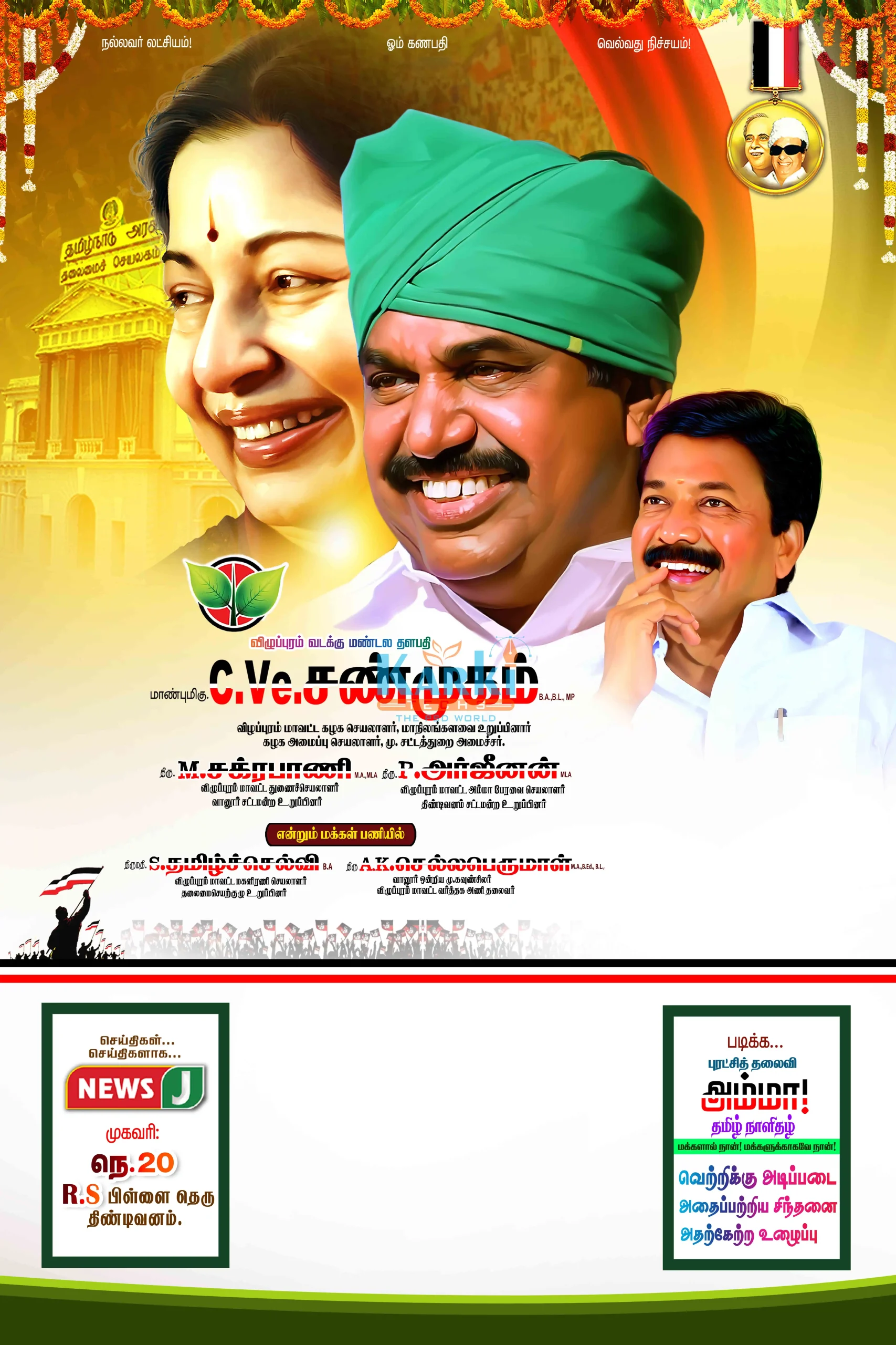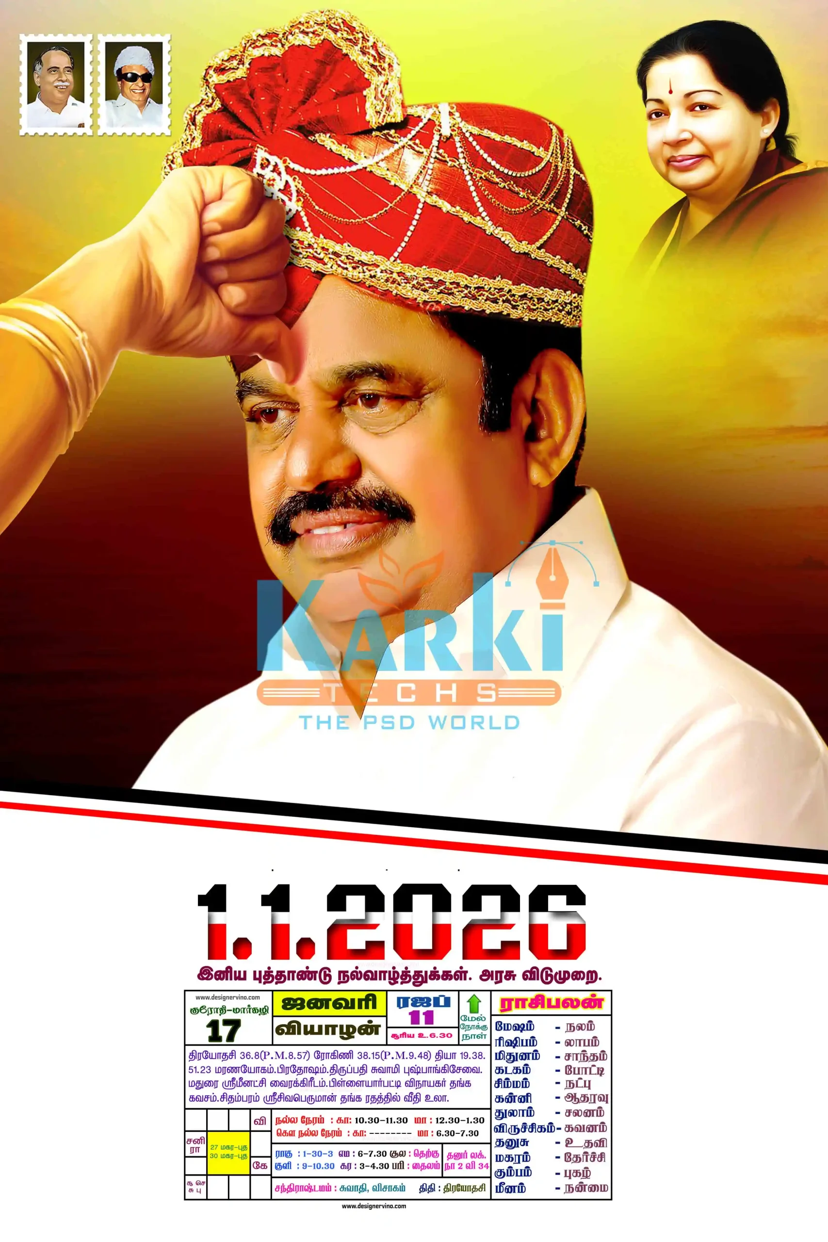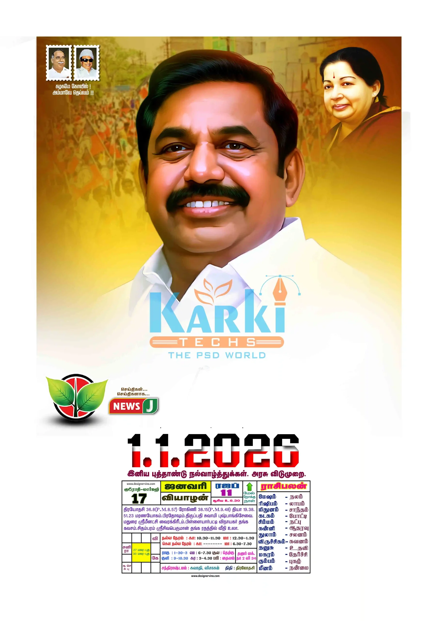 This premium pack includes fully layered, high-resolution PSD files designed especially for daily Tamil calendars featuring ADMK colors, leaders, and traditional motifs.